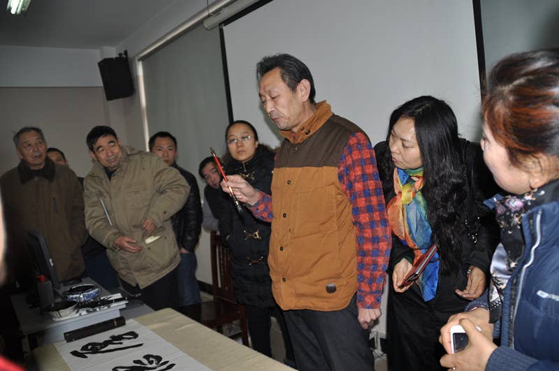 河南省大未来书画院院长邹蓝天,秘书长傅伟华代表书画院与广大艺术爱好者亲密接触,他们把自己多年来对艺术创作的经验与大家分享。傅伟华老师主要讲授了书法课程,他不仅书法写得好,更是篆刻艺术的专家;在讲课中,他从书法的用纸、笔等准备材料、到书法的起笔、运笔、停顿、到落款、印章等一一讲解,他的讲解宛如山涧流水,娓娓道来,下面不时传来阵阵的掌声,喝彩声,那是大家对他艺术实力的肯定,更是对他人品的肯定。