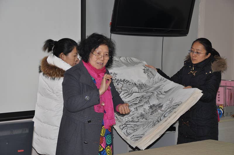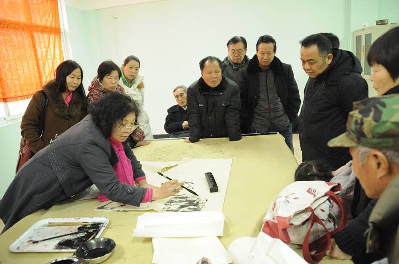 邹蓝天老师对中国的传统山水及花鸟有深入研究,对传统笔墨有独到的认识,道家文人水墨画更加突显了她那高深的内涵,她不仅与大家分享了传统山水画的博大精深,并给大家做了大量的示范,她强调,好画并不一定用很多的墨来画,要把“惜墨如金”运用到我们的绘画当中,古人通常是用最少的笔墨画出最丰富的画面;历史名画大多清新淡雅、耐人寻味、永恒经典,她的讲解过程中有老者聚精会神的记录、有的请老师做示范、更有书画爱好者拿出自己的作品请名家指导,邹老师都对他们耐心的做了解答。