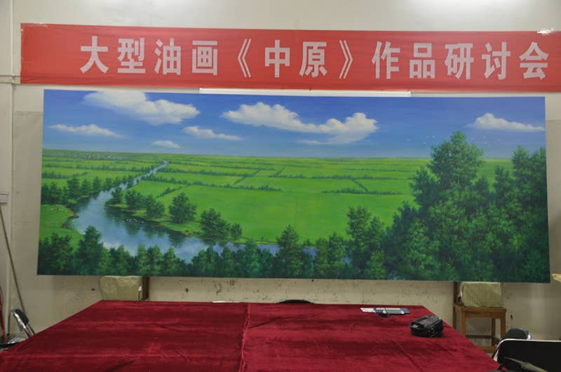 曹振华教授谈了创作此幅作品体会,他说,这幅作品不仅仅是一幅风景的油画作品,更有深刻的社会内涵:那条弯弯的河流是一曲轻缓的音乐,直插云天的杨树代表中原地区蓬勃发展,广阔的麦田意味着中原地区粮食的大丰收,牛喝水、羊吃草、鹅在水中嬉戏象征中原地区人民幸福安康,生活快乐……艺术源于生活高于生活,希望这幅作品能给大家带来感官上愉悦享受,也希望大家能提出宝贵的意见建议。